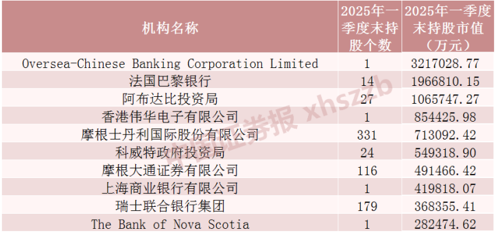 在692只QFII重仓股中,新加坡华侨银行有限公司(Oversea-Chinese Banking Corporation Limited)一季度末持仓市值最高,为321.7亿元;法国巴黎银行、阿布达比投资局持仓市值分居第二、第三位,分别为196.68亿元、106.57亿元;香港伟华电子有限公司紧随其后,持仓市值超过85亿元;摩根士丹利国际股份有限公司、科威特政府投资局、摩根大通证券有限公司、上海商业银行有限公司持仓市值均超过40亿元。